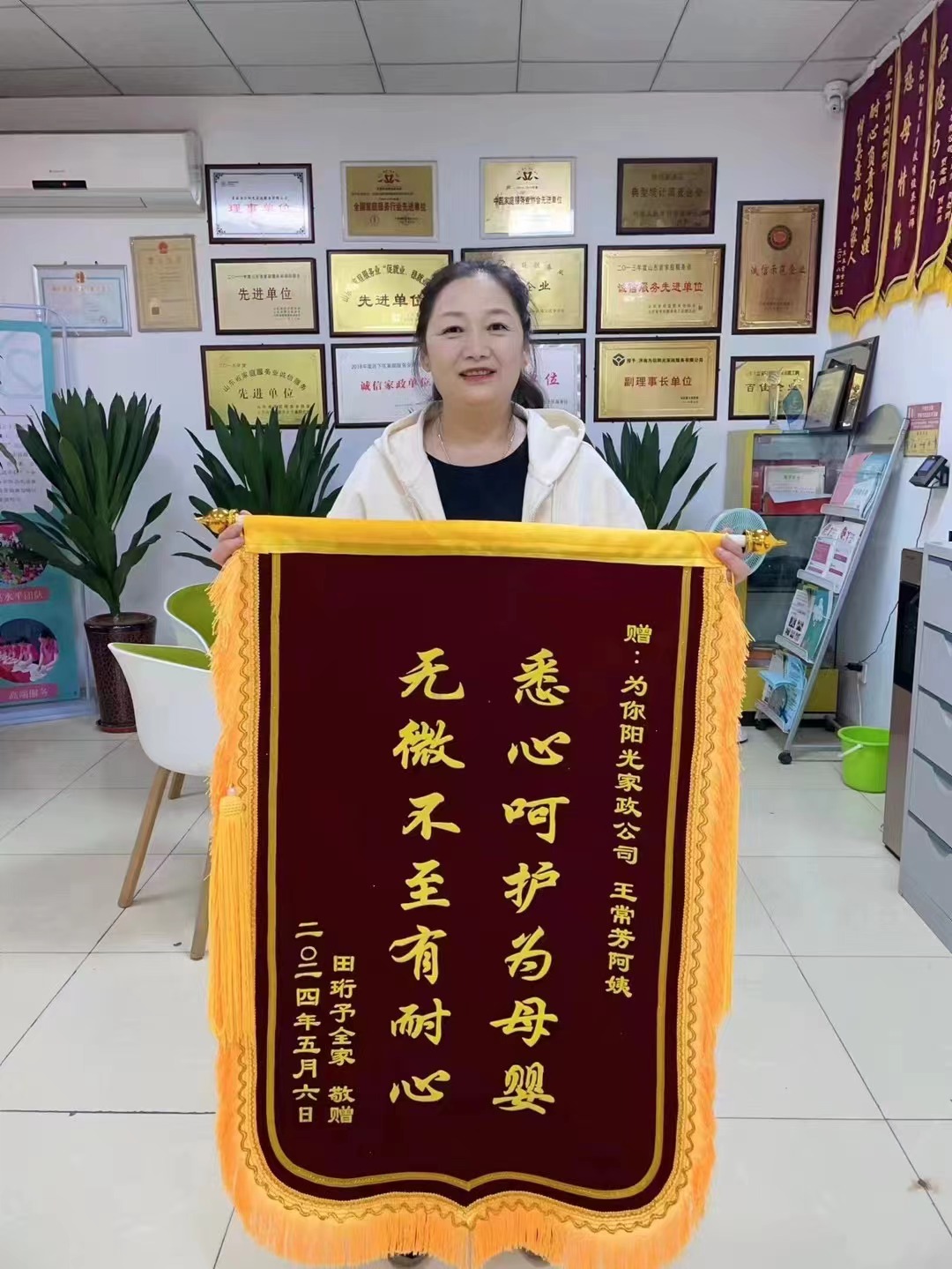 感恩客户田老师及家人对我们为你阳光的信任和支持,客户为感谢我们的月嫂王常芳老师对其家人的细心照顾和用心服务,特意送来一面锦旗,感谢员工全心全意的付出!
